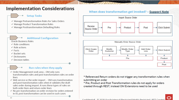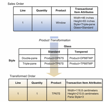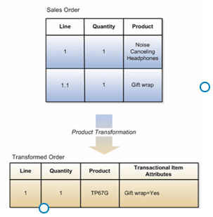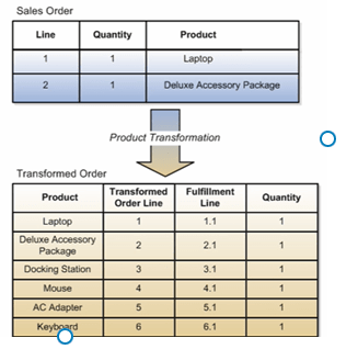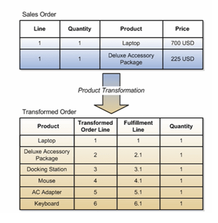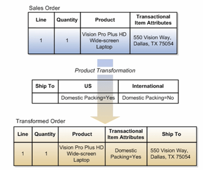 Order Management automatically transforms Sales Orders to Transformed orders according to rules you setup. For example, you might setup a transformation rule that defaults a country-appropriate AC adapter for a laptop based on the ship-to country on the Sales order.