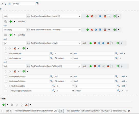 - In Then section, if you want to default value in Fullfillment line EFF select PostTransformationRules.Set Value to Fulfillment Line Extensible Flexfields