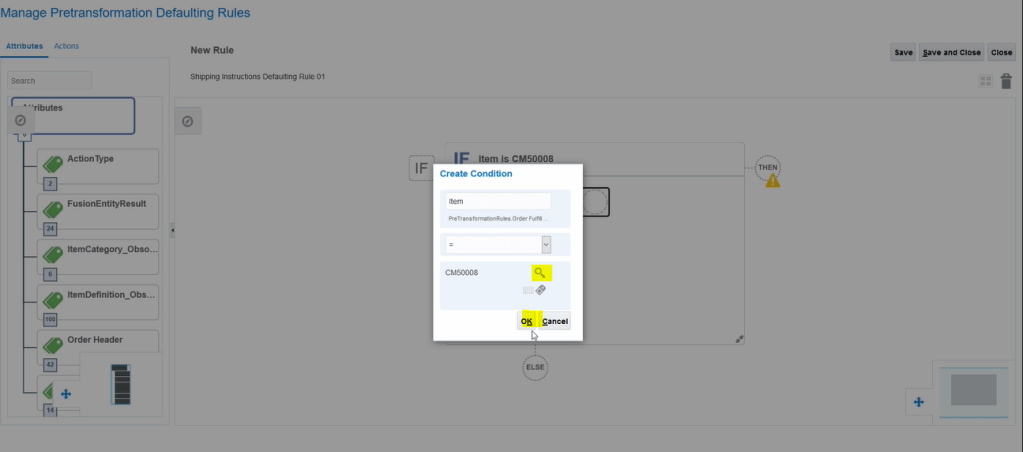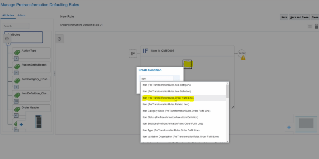 - Enter Item and Search for Item.preTransformationRules.OrderFulfillLine