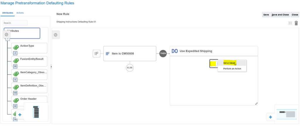 a.Select Set a Value-> Enter attribute-> Warehouse( Order Fullfill Line) -> is set to ->click on lens icon to search values or click on attribute to select any attribute value