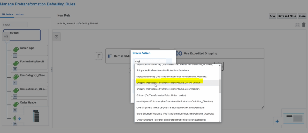 - In Create Action > select Shipping Method = Shipping Instructions(PreTrasnformationRules.Order Fulfill Line)