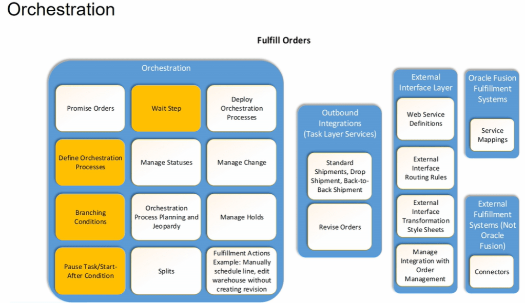 - Orchestration Fulfillment Systems-> It could be either Inventory system, Shipping or Invoicing system within Oracle cloud or could be External fulfillment system.