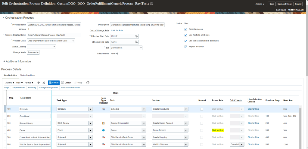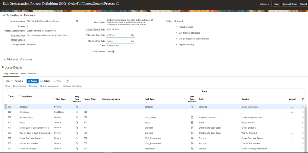- Navigation: Go to Others -> Setup and Maintenance -> Order Management -> Enter Rules “Manage Orchestration Process Definition”