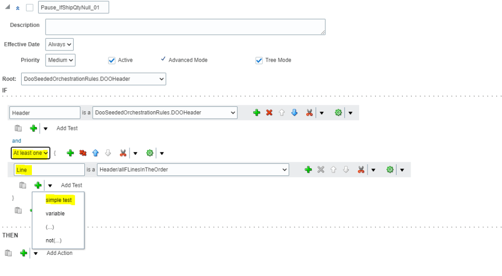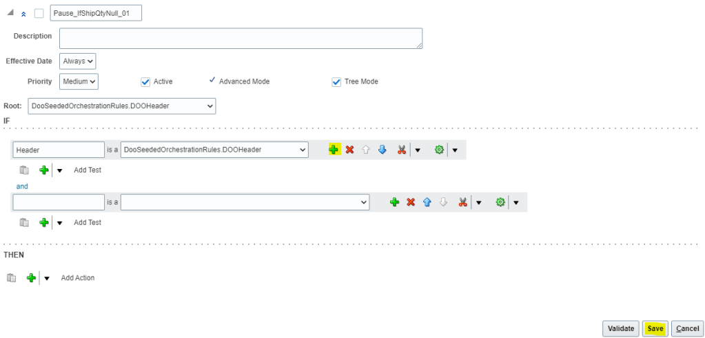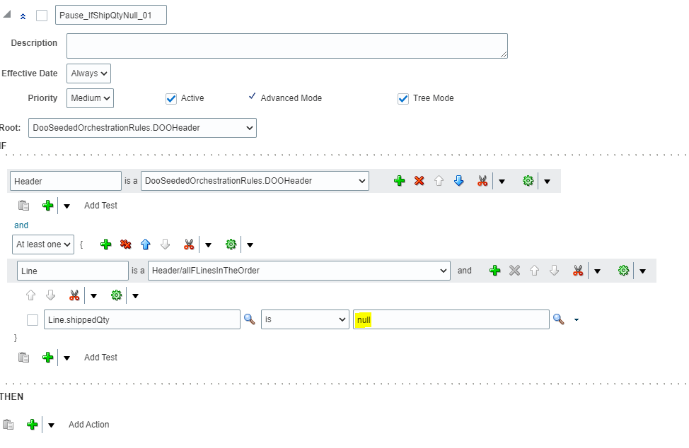- Give Name of the Rule = “Pause_IfShipQtyNull_01” . Check Active, Advanced and Tree Mod