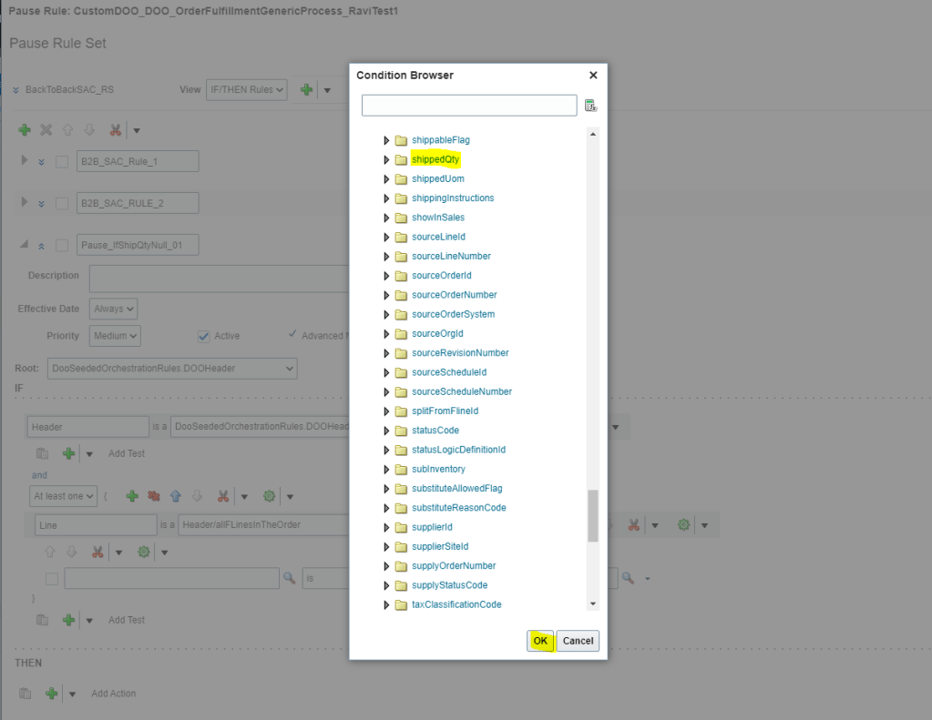 - In the Condition Browser on Left Side, expand Line, and then select “shippedQty” and click OK.