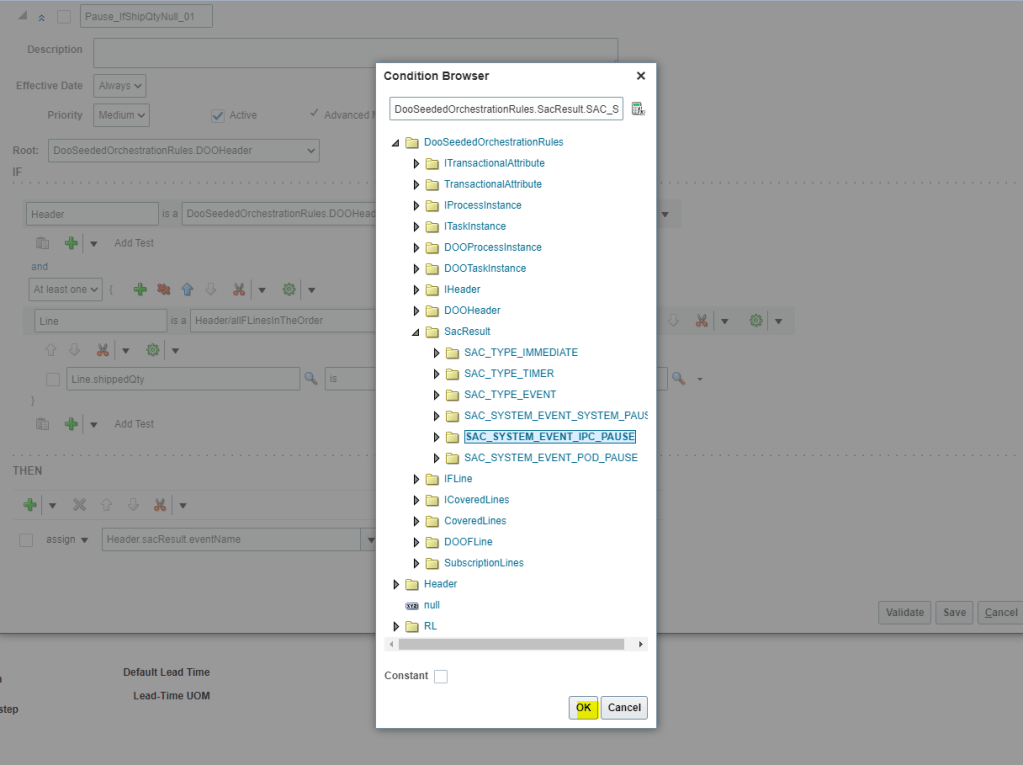 - In the Select a Target list, select “Header.sacResult.eventName” and on left side In the Condition Browser, expand DooSeededOrchestrationRules and then SacResult. Select “SAC_SYSTEM_EVENT_IPC_PAUSE”.