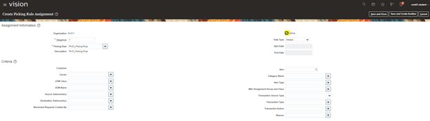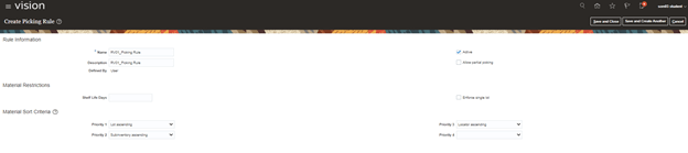 - Enter Values as shown below. Criteria can be given accordingly for Picking Rule.