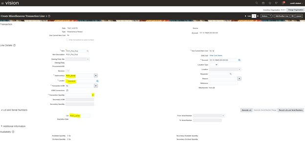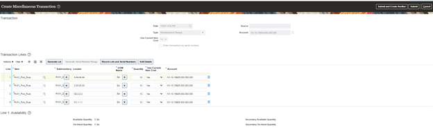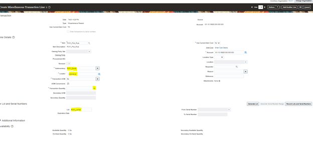 Step 4: Create Miscellaneous Receipt at Subinventory and Locator Level providing Lot Number.