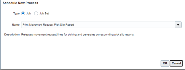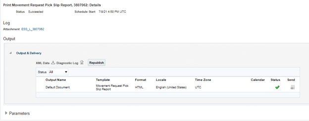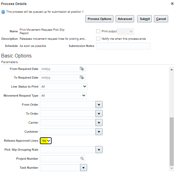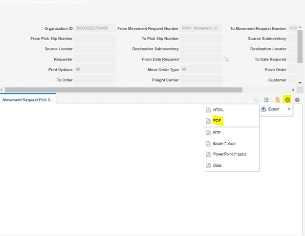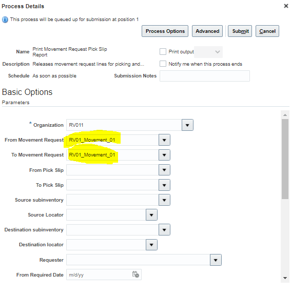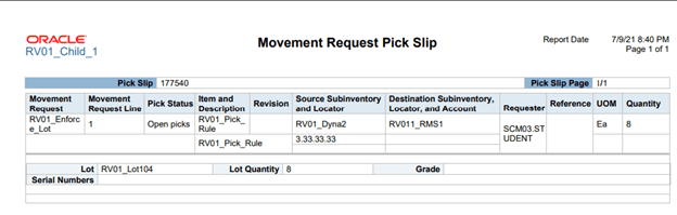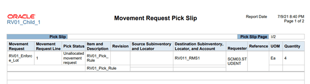 - Submit Job for Print Movement Request Pick Slip Report to allocate movement.
