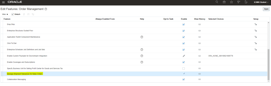 - Navigation: Go to Others -> Setup and Maintenance -> Actions -> Select Offering -> Select Order Management -> Opt-In Features. Select Features for Order Management. Verify if Enable check box is selected for “Manage Shipment Tolerance for Sales orders“.