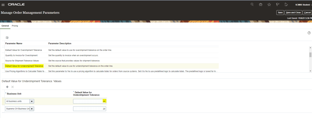 - Select “Default Value for Undershipment Tolerance” and set it to “20” and for “Default for Overshipment Tolerance” set it to “10”,