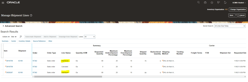 - Verify that shipment lines are in “Interfaced Status” and Shipped quantity is what we selected above.