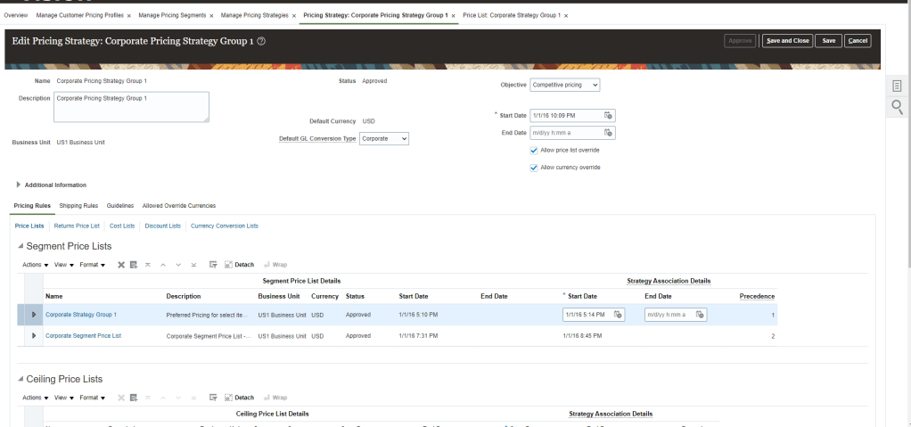 - Search for existing Pricing Strategies or create a new one. In below case we took Corporate